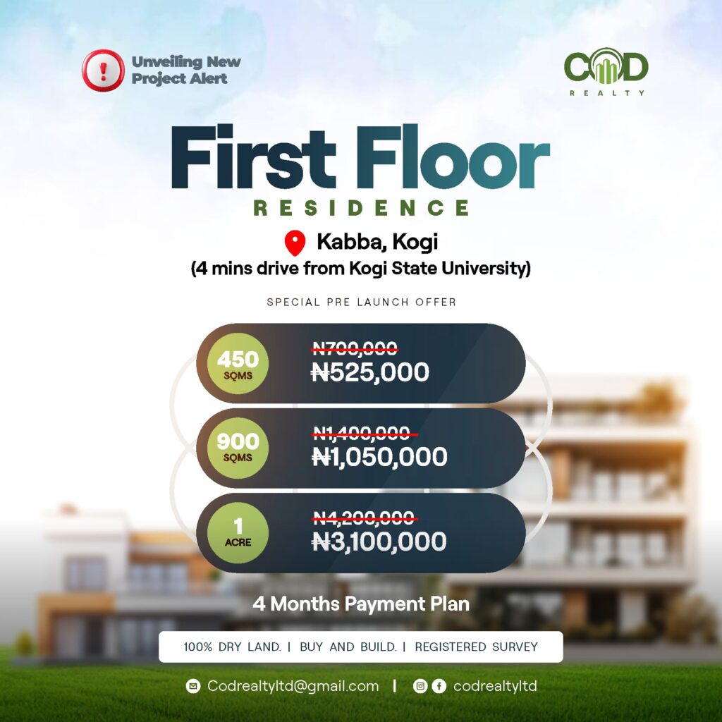 To learn more about First Floor Residence, Kabba, and the investment opportunities available, reach out to COD Realty Ltd. Don’t miss this chance to be part of Kogi State’s growing real estate sector.